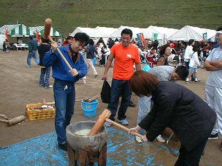 餅つきもしてました。(販売用) 画像は地元の人に捕まって餅つき体験をするメンバーです。 |