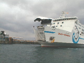 今回のツーリングになんと京都からHIRO.Fさん、島根からK-ageさんが参加してくれることになりました。 (2人揃ってH/K AGESと言うストリートミュージシャンです。) 31日の昼、西大分港にHIRO.Fさんをお迎えに行きました。 多分この船に乗ってるはずなんですが・・・。 |