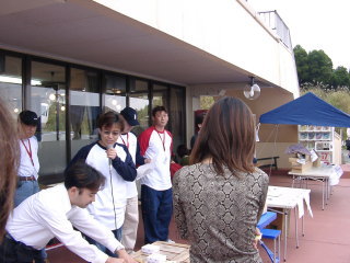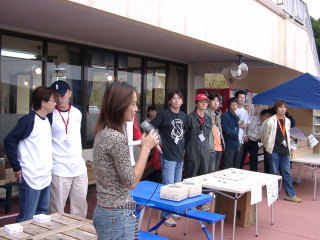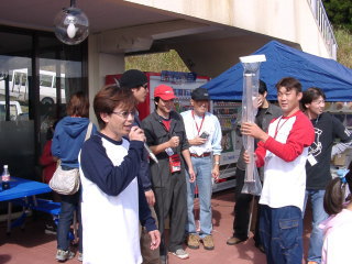 本部の方へ耳を傾けて抽選番号を聞いてます。 | |