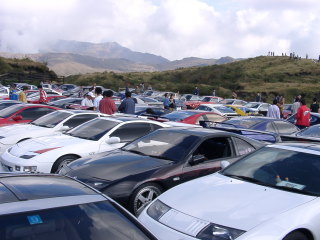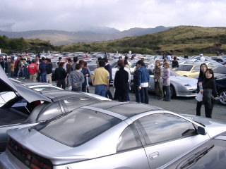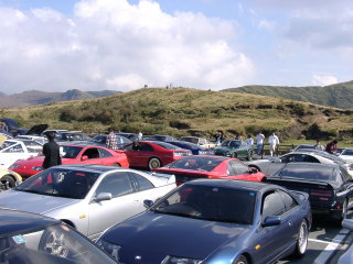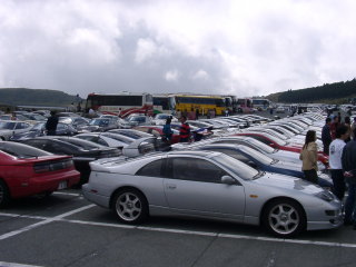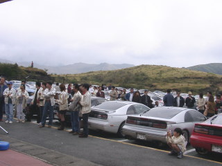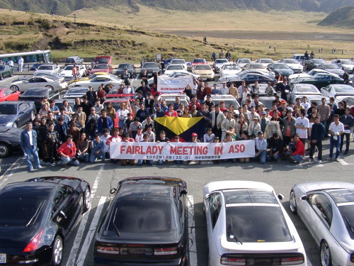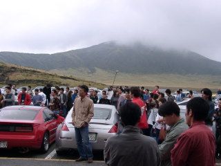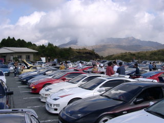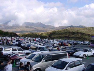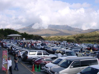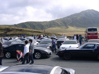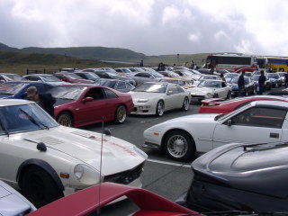 場所は飛んで、ここが集合場所の阿蘇の草千里。 手前は一般車ですが奥は全部Zです。 予想外の台数で通路までギッシリ停めました。 大体130台ぐらい集まったようです。 |