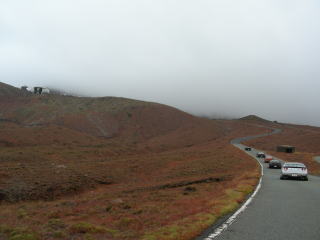 山頂駐車場。 後ろの湯気が火口です。 |
