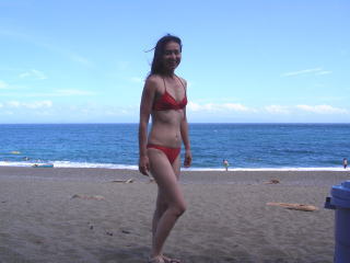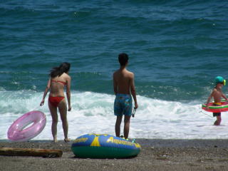 | 波打ち際で様子を見るしかない・・・。 ちなみに私は泳ぎには自信があるのでちょっとだけ沖に出たんですが、それでもやばいと思った・・・。 |