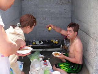 | 昼食時間。 お待ちかねのバーベキュー。 風が強く、砂も舞ってるので道路から浜に降りる階段の支柱?の間にコンロを設置。 |