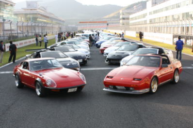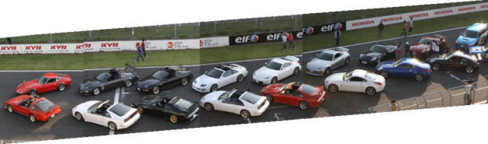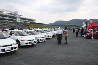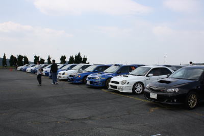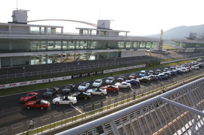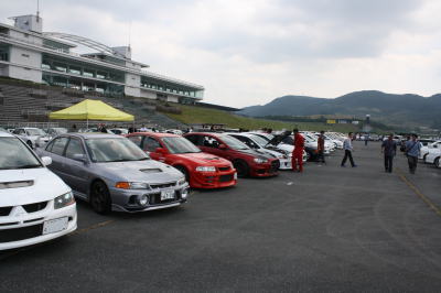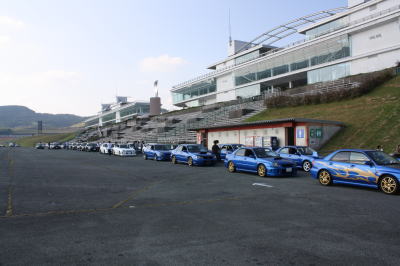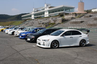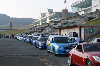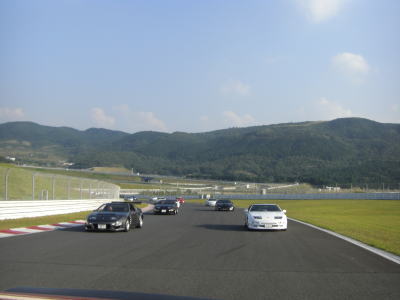 | 最後はメインストレートに並べて記念撮影タイムです。 長すぎて後ろのインプやランエボまで写らないや。。 |