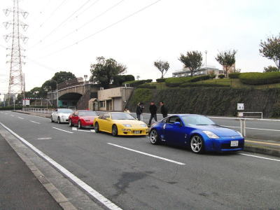 | 早朝の集合場所。 私(100)は退院まもない為、ロングツーリングは厳しく今回はお見送りのみです。 ここからは青黄白の3台でスタート。 |