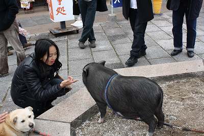 | それぞれ昼食や参拝に移動。 参道に今年の干支の黒い「兎」もいましたブー。 左じゃないよ右だよ。 |