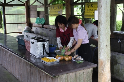 女性陣は食材のカットを。 | |