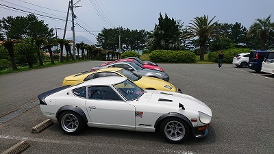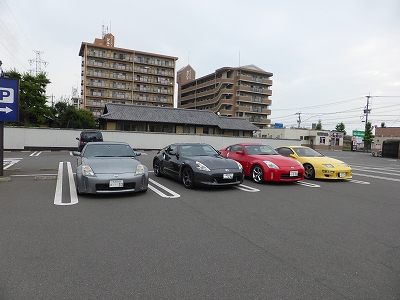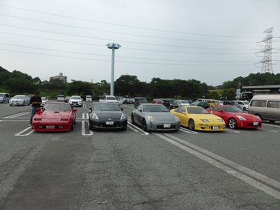 | 集合場所の平和市民公園。 は朝早くてまだ施錠していたので、近くのうどん屋の駐車場。 1人寝坊で来ず。 取りあえず4台でスタート。 会長のZ31はレストア中なので、私(100)の助手席。 |
